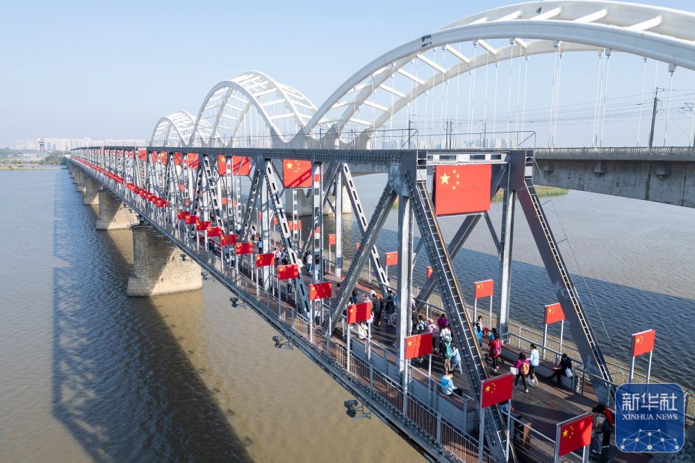↑10月1日,游客参观了哈尔滨的Binzhou铁路桥。照片:新华社张道的记者