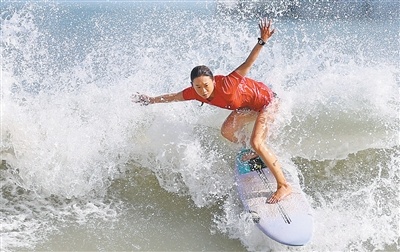 海南队的运动员将参加冲浪比赛的女子短板比赛。